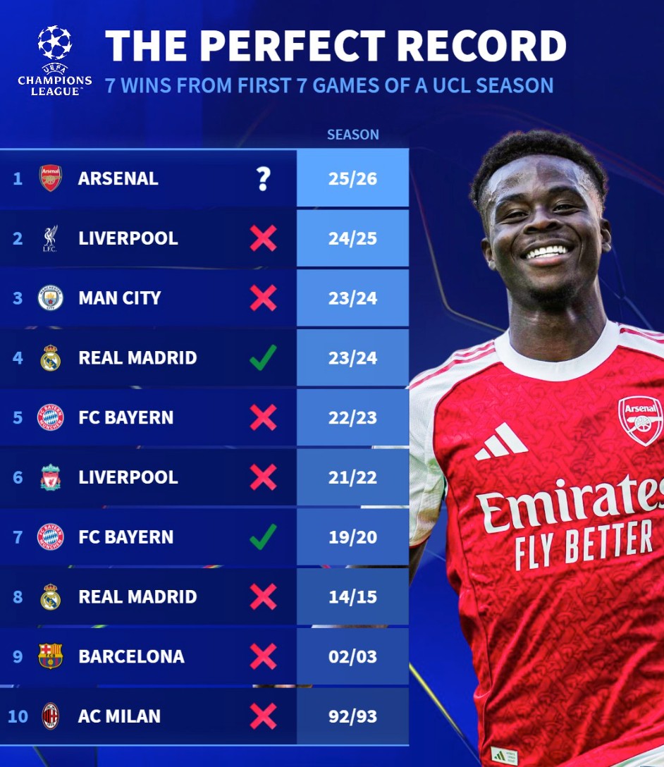 北京时间1月23日,在阿森纳以7战全胜的傲人成绩领跑本赛季欧冠联赛阶段的积分榜之后,来自德转的统计指出,枪手是欧冠历史上第10支取得开季7连胜的球队。根据德转的统计,在阿森纳之前欧冠历史上曾有9支球队达成过开季至少7连胜的成就,但其中只有19-20赛季的拜仁以及23-24赛季的皇马拿到了最后的冠军,其余的7支球队包括92-93赛季的米兰、02-03赛季的巴萨、14-15赛季的皇马、21-22赛季的