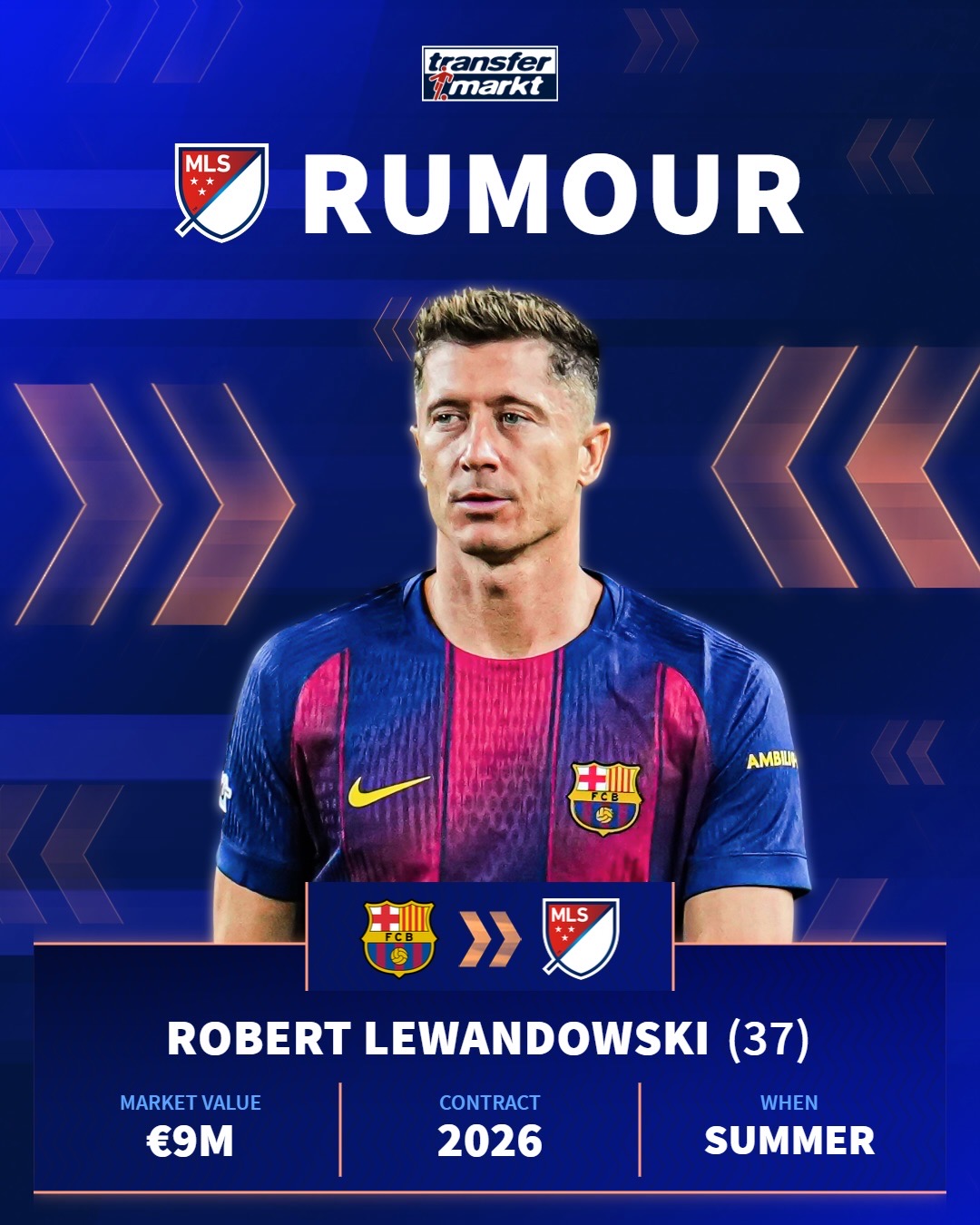 来自转会市场的报道:莱万多夫斯基可能要离开巴塞罗那,前往美国继续发光发热!说说看你的观点: